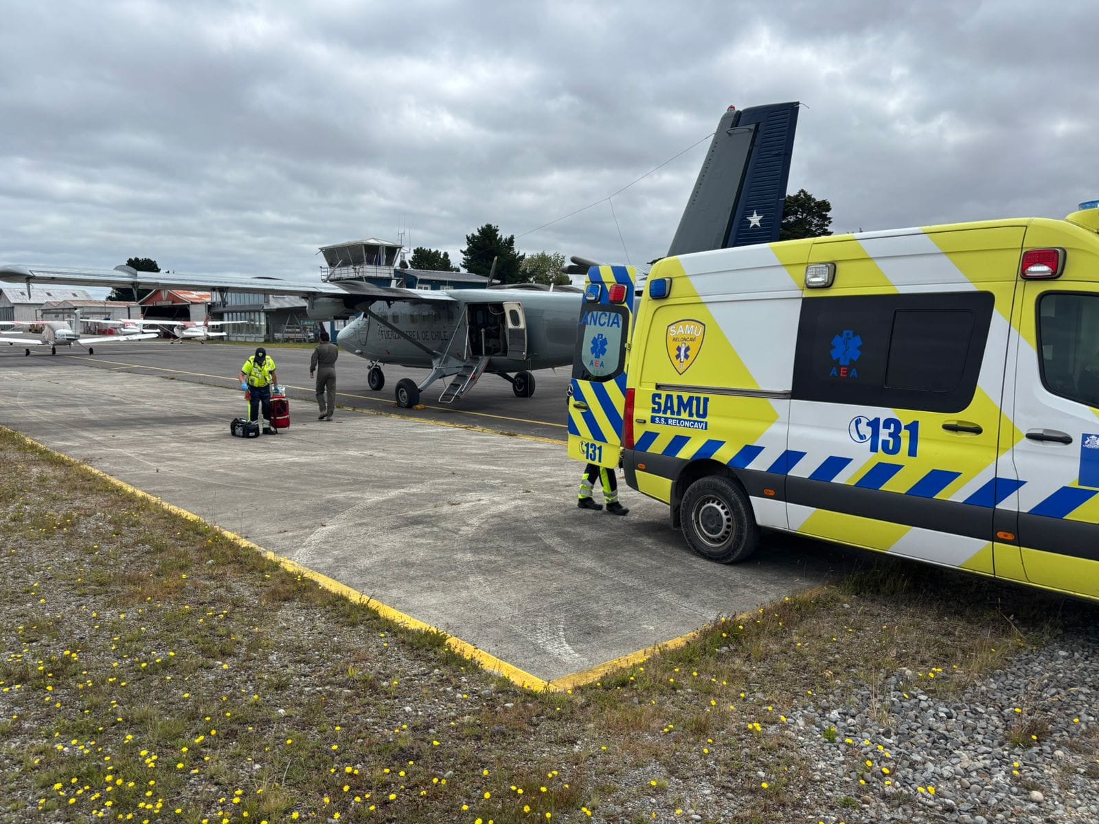 Una vez en la loza del aeródromo civil puertomontino, el operativo continuó con una coordinación precisa: personal del Servicio de Atención Médica de Urgencia (SAMU) ya se encontraba en el lugar esperando el arribo del avión.
