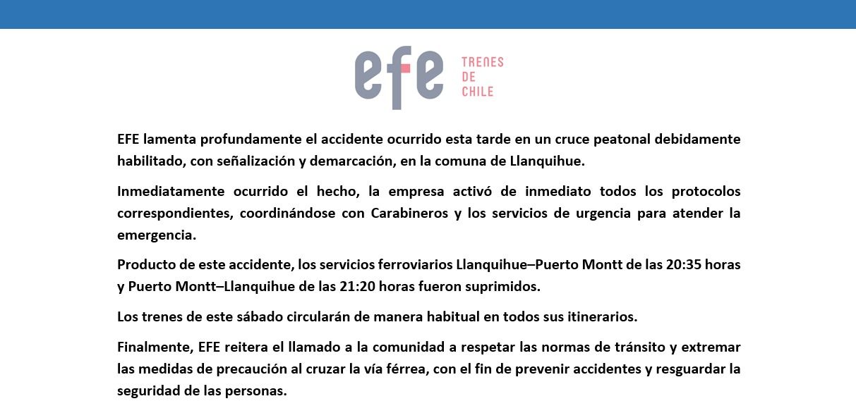 EFE lamenta profundamente el accidente ocurrido esta tarde en un cruce peatonal debidamente habilitado, con señalización y demarcación, en la comuna de Llanquihue.